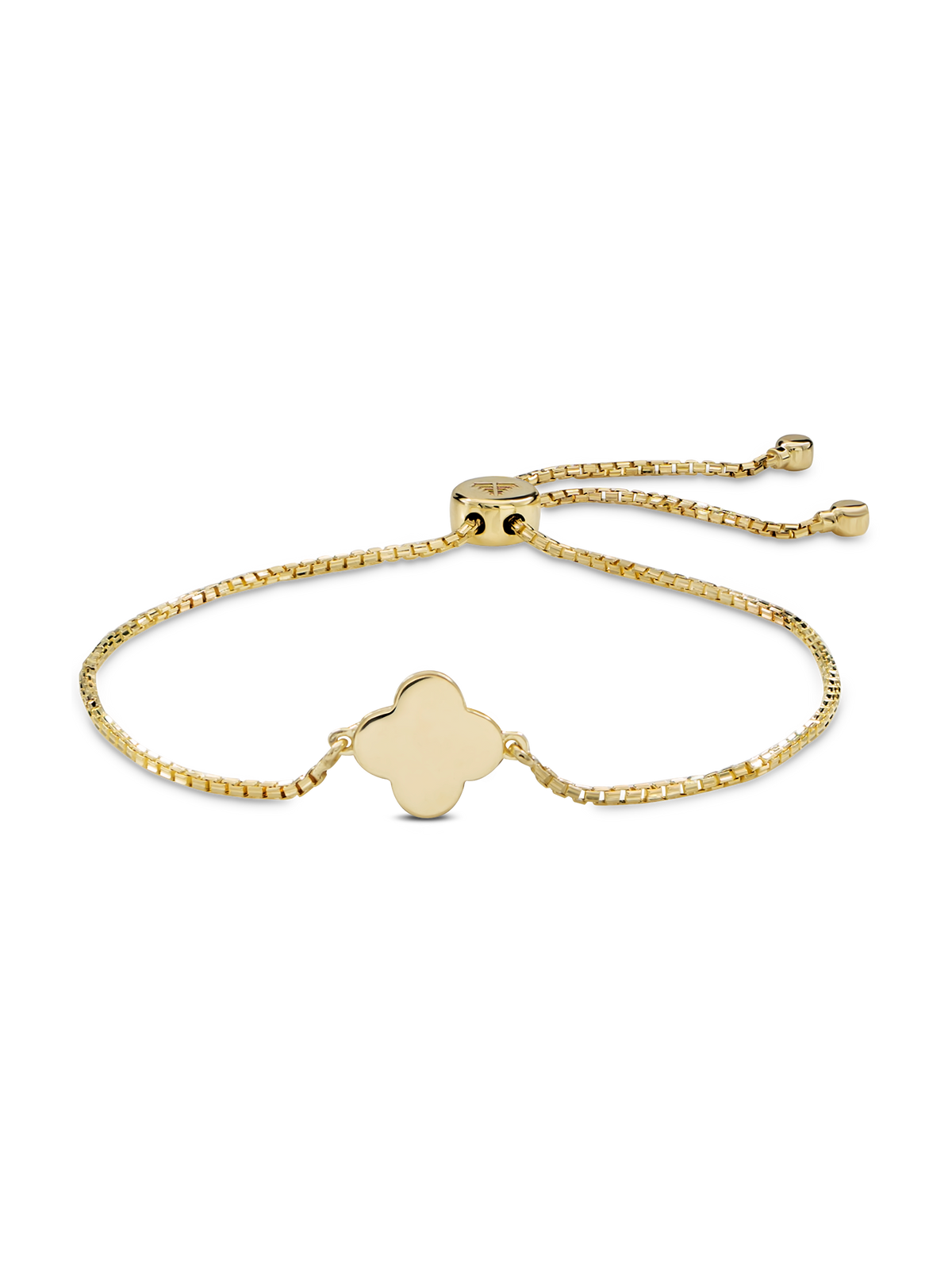 DEVATA clover box chain slider bolo bracelet crafted in solid 14K yellow gold.
